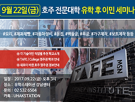 | [9월 22일(금) 강남] 호주 TAFE/ COLLEGE 전문대 입학설명회 초대글 (호주 유학 후 이민 세미나) (0) | 2017.08.28 |